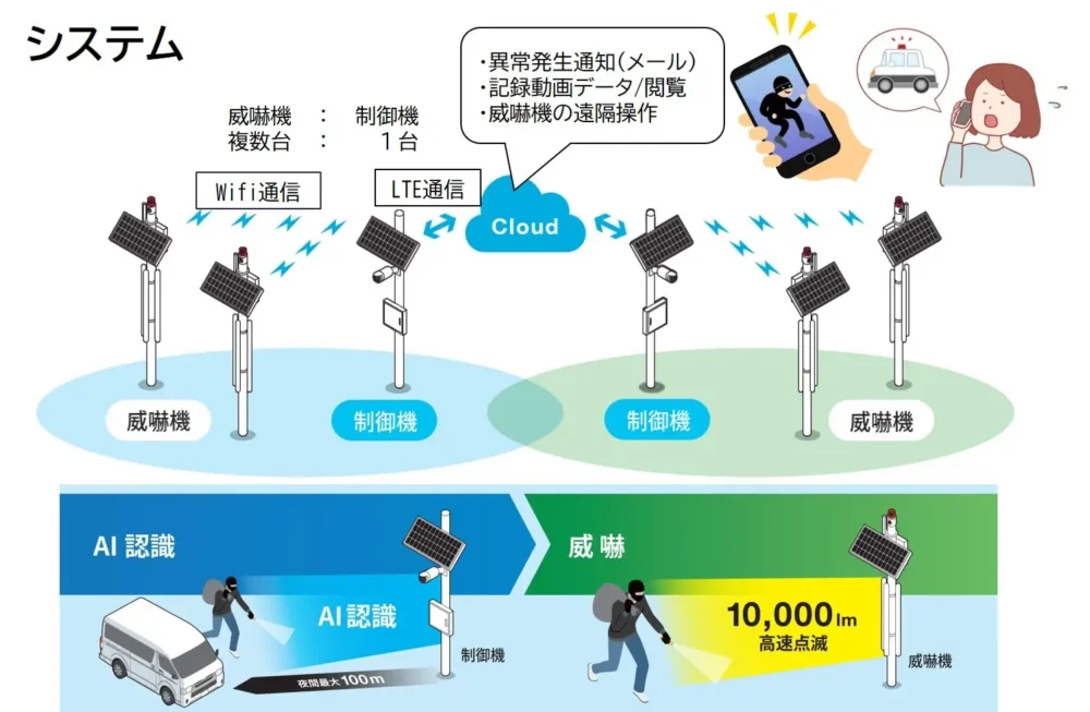 光と音で不審者を威嚇し、犯行の邪魔をする